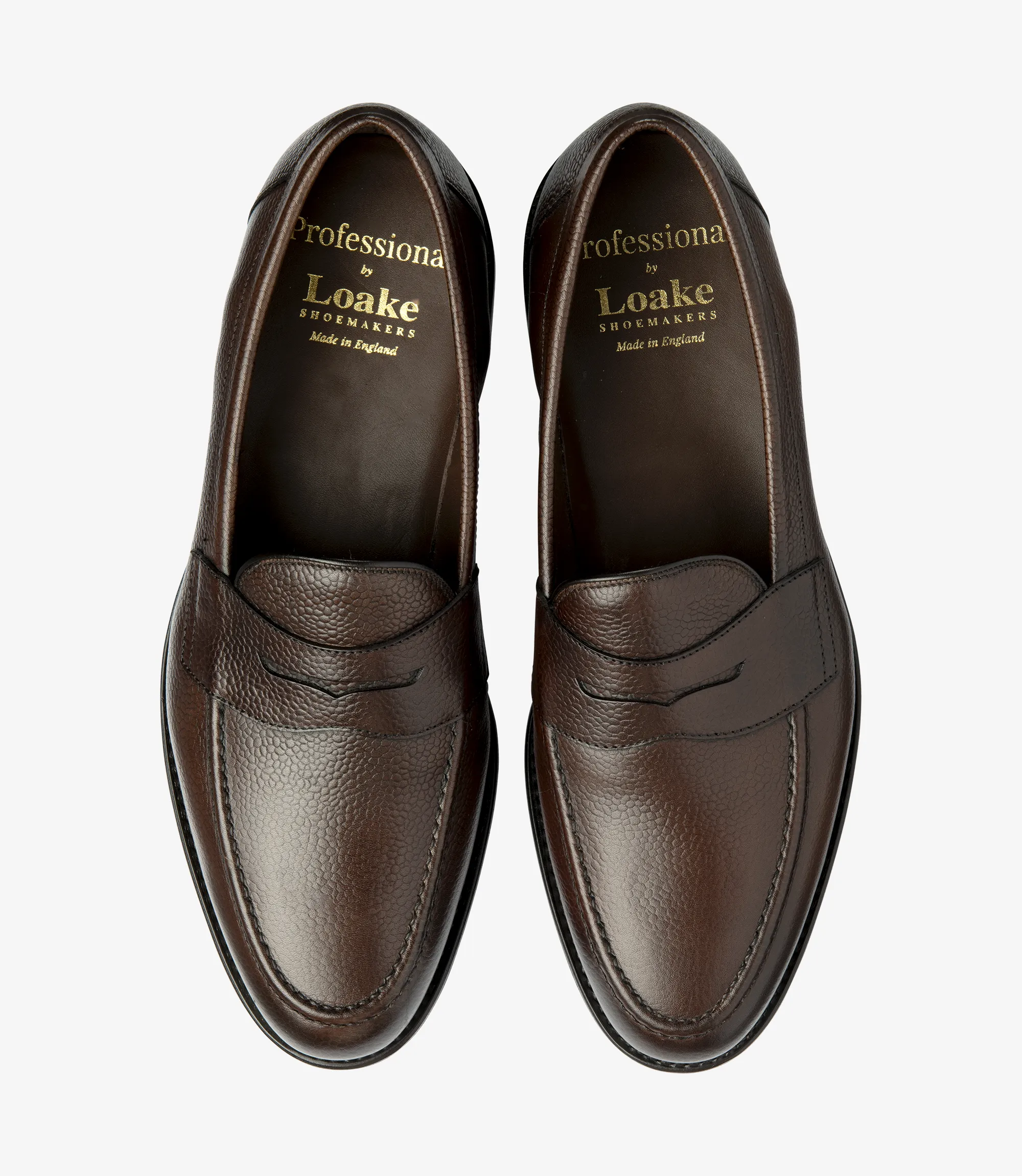 The Loake Imperial is a premium pair of men’s shoes, styled as a classic penny loafer and crafted from distinctive dark brown grained calf leather for a refined, textured finish. Built on the traditional College last, it offers a comfortable F fitting and timeless loafer silhouette, making it a versatile option for both smart and casual wear. Featuring durable Goodyear welted rubber soles, Imperial provides excellent grip, long-lasting durability, and the option of resoling to extend its life. Designed and engineered in Northamptonshire, England, and handmade in our high-grade factory in England, it reflects the very best of British shoemaking. A sophisticated loafer that blends heritage craftsmanship with modern practicality.